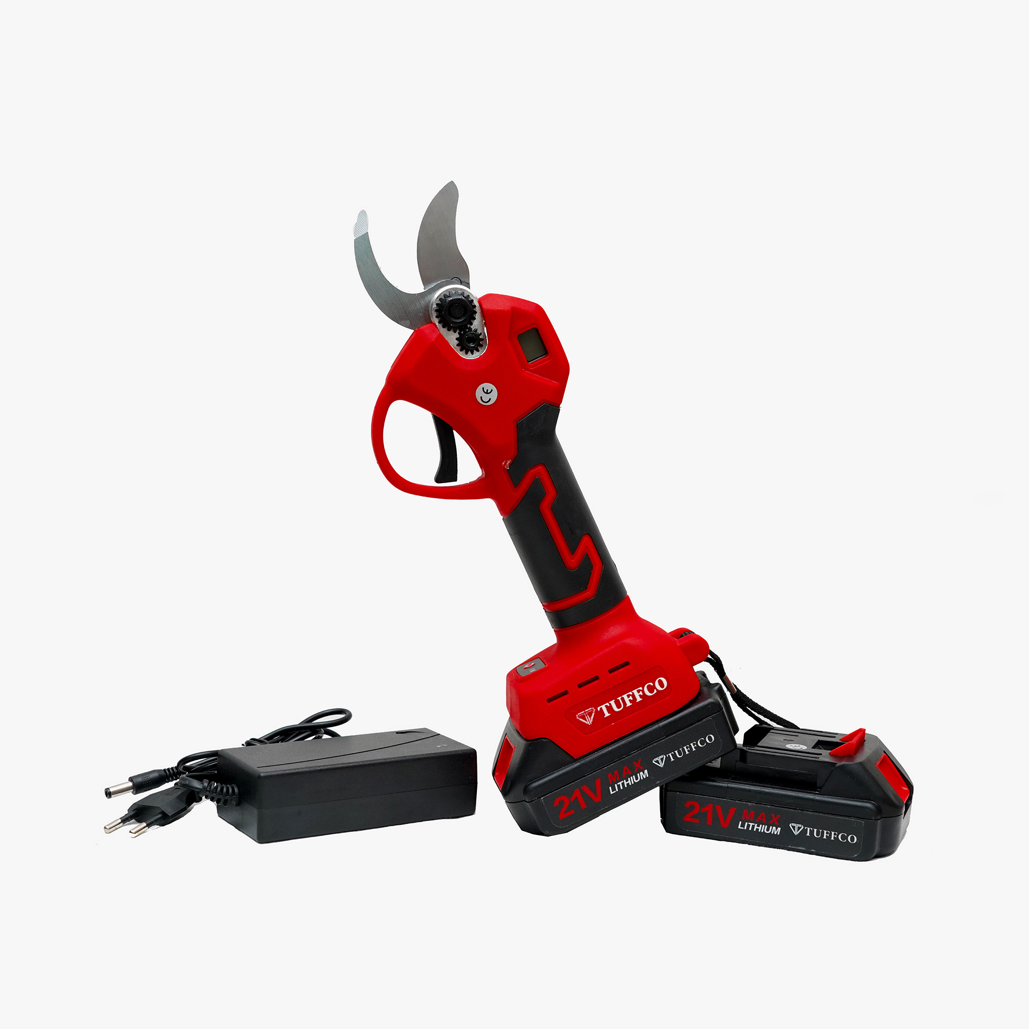 Tuffco Brushless cordless Pruner with 500 W power, super strong SK5 Alloy Steel Blade with Opening Diameter of 5cm & 3cm. 4cm knife edge with 2* 21 V – 2 Ah Batteries, Quick charger, case.
